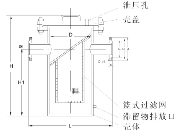 管道在安装时会有其它杂物带入管道,在生产中原材料中也含有杂物。管道里液体经过过滤器时它的污物由过滤器收集到滤网中,在一定的程度时打开壳盖清理滤网即可。如下图: