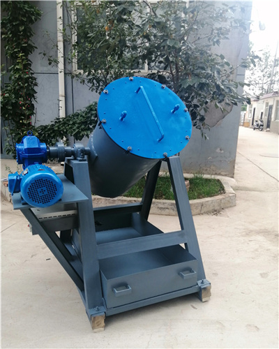 3.减速系统:由电机、联轴器、涡轮减速机等组成。起到带动转筒运转。该机配用的减速机具有自锁功能,可以在任意位置停止,方便使用时的卸料。加水等工作。减速机有双输入轴,一端联结转筒,另一端配有摇动手把,需要调整转筒位置或放料时,将摇把插入输入轴转动,即可调整转筒位置。