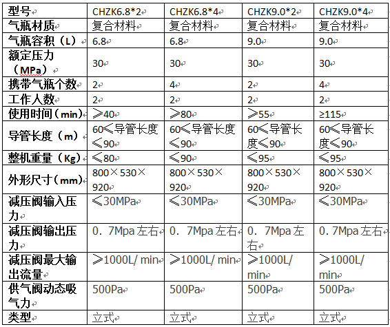 泰安宇成CHZK系列车载式长管空气呼吸器(以下简称呼吸器)目前有四种型号:CHZK6.8*4、CHZK6.8*2、CHZK9.0*4、CHZK9.0*2。该产品也称移动气源,是一种车载自给开放式正压型长管空气呼吸器。
