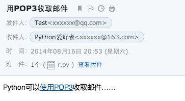+OK Welcome to coremail Mail Pop3 Server (163coms[...]) Messages: 126. Size: 27228317 From: Test <xxxxxx@qq.com> To: Python爱好者 <xxxxxx@163.com> Subject: 用POP3收取邮件 part 0 -------------------- part 0 -------------------- Text: Python可以使用POP3收取邮件……... part 1 -------------------- Text: Python可以<a href=...>使用POP3</a>收取邮件……... part 1 -------------------- Attachment: application/octet-stream