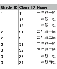 ---------+----------+---------- grade_id | class_id | name ---------+----------+---------- 1 | 11 | 一年级一班 ---------+----------+---------- 1 | 12 | 一年级二班 ---------+----------+---------- 1 | 13 | 一年级三班 ---------+----------+----------