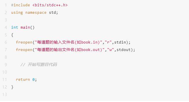 考试的时候直接用以上程序框架就行,然后在freopen()下面开始写程序。学生做题时为了方便测试,可以暂时先把两个freopen()注释掉,但是最终提交的程序里面一定要有freopen()做文件输入输出重定向。