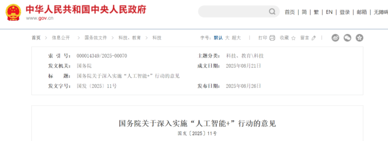 8月26日,国务院印发《关于深入实施“人工智能 +”行动的意见》,明确了“人工智能 +”科学技术、产业发展、消费提质、民生福祉、治理能力、全球合作6大重点行动。