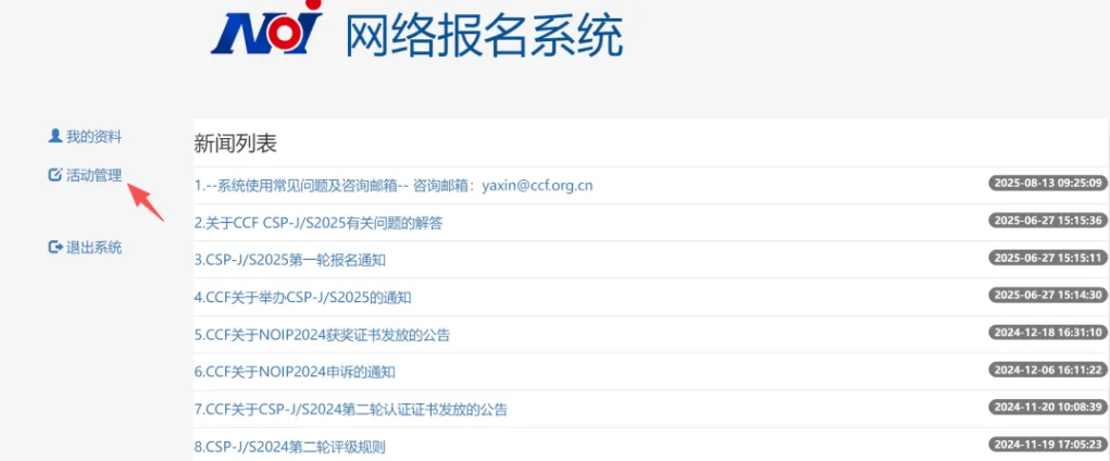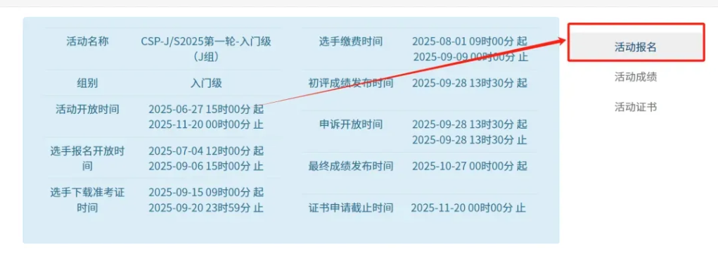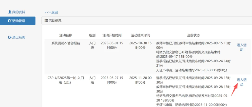 找到 2025 年 CSP-J/S 认证对应的活动,点击 “进入活动”——划重点!如果同时报了 J 组和 S 组,要分别点击进入,打印两份准考证,千万别漏了!