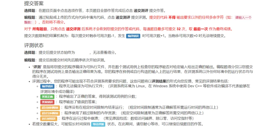 编程题:代码里别加多余内容(比如“请输入一个整数:”),否则会不得分;每道题最多提交32次,最后一次提交的成绩算最终结果(编译错误会返还1次提交机会,不用慌)。