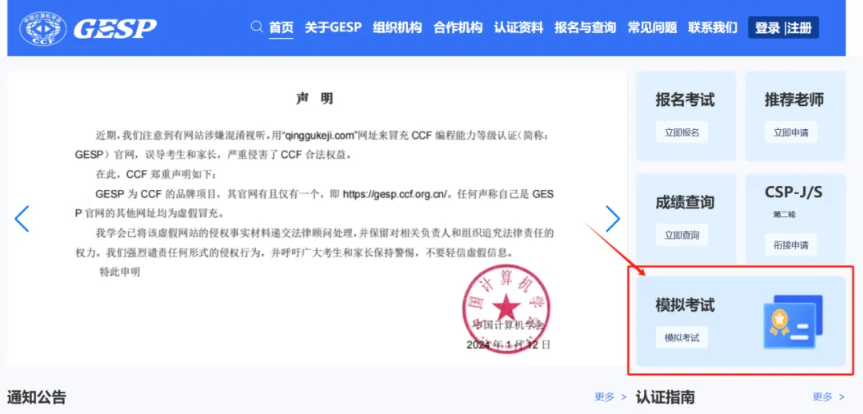 1.用谷歌浏览器登录GESP官网: https://gesp.ccf.org.cn,点击首页“模拟考试”。