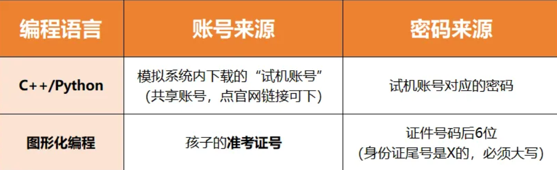 C++/Python:试机账号是共享的,只能用来熟悉流程(比如看题目、提交代码的步骤),不能真正交卷,重点让孩子摸透操作逻辑就好。