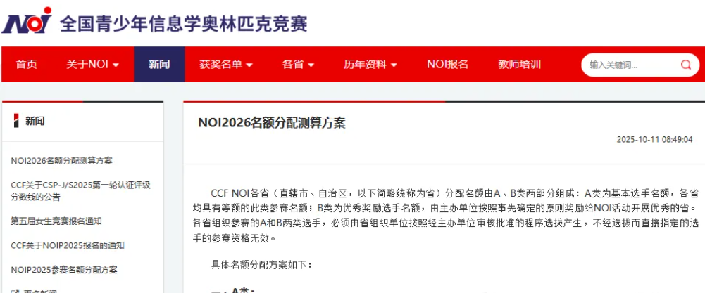 CCF NOI各省(直辖市、自治区,以下简略统称为省)分配名额由A、B类两部分组成:A类为基本选手名额,各省均具有等额的此类参赛名额;B类为优秀奖励选手名额,由主办单位按照事先确定的原则奖励给NOI活动开展优秀的省。各省组织参赛的A和B两类选手,必须由省组织单位按照经主办单位审核批准的程序选拔产生,不经选拔而直接指定的选手的参赛资格无效。
