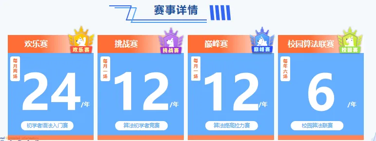 此外,为了增加学员参加竞赛的实战经验,我们在课程学习环节中还设置了不同层次和级别的竞赛,如欢乐赛/排位赛/模拟赛等。