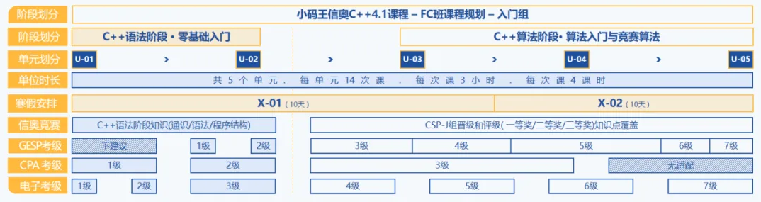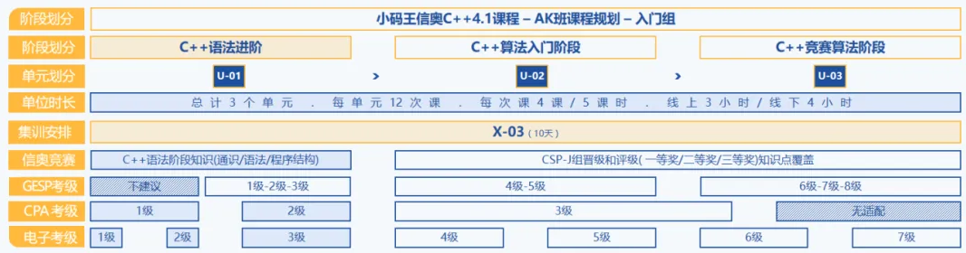 码王信奥AK班入门组课程体系主要分为:C++语法阶段、C++算法入门阶段、C++竞赛算法阶段三个单元,每个单元有十二节课,每节课五个课时。