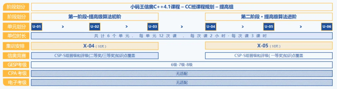 小码王信奥CC班提高组课程体系主要分为提高级算法初阶和提高级算法进阶两个维度,每个单元有十二节课,每节课2小时,三个课时。提高组课程入班需严格遵守提高选拔标准。