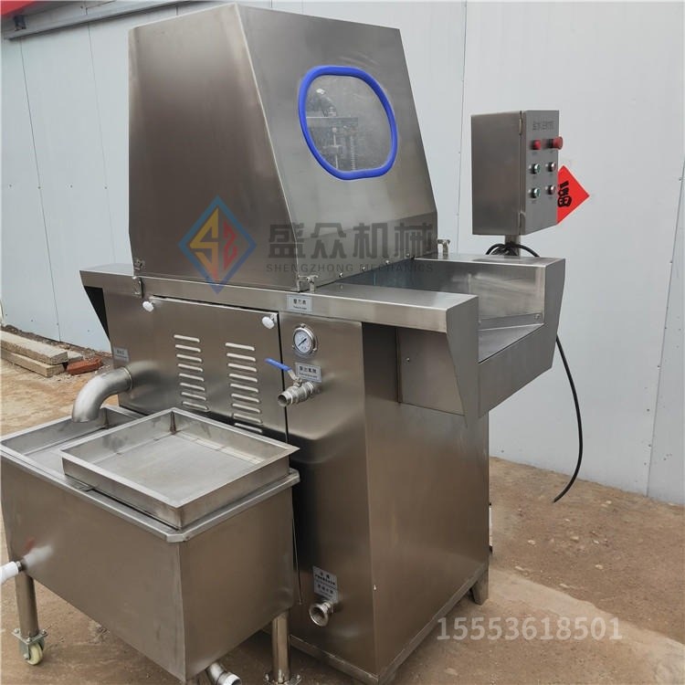 本机除用于肉类加工外,通过更换针头还成功应用于鱼类、海参、禽类等产品的注射加工。材质采用不锈钢材料制作,设计合理。送肉链条可全盘托出,清洗方便,针头排列为单针单管,设有自动保护装置,当注射针头碰到硬物时,注射针自动弹起,不受损坏,真正达到了注射的肉无死角。(食品加工机械厂家Tel:155*5361-8501)