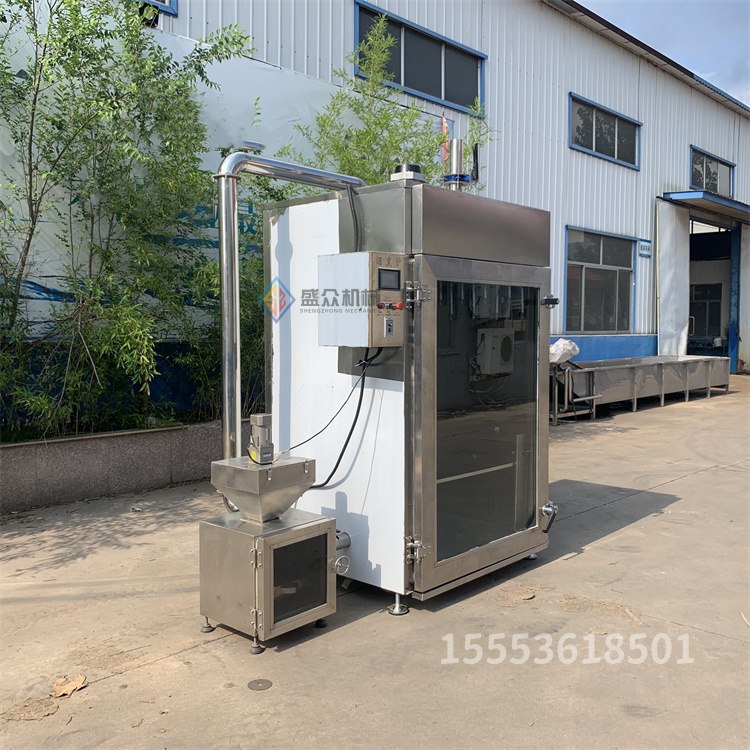 烟熏炉是肉类产品熟制的关键性设备。可蒸煮各种香肠、火腿肠、干肠、腊肠、烤肉及各种鱼等。操作简单、方便可靠。主要适用于香肠、培根、鱼片、鸡翅、鸡腿、鸭脖子、牛肉干、腊肉、腊肠、豆干等食品的加工。蒸煮、烘干、烟熏、上色,四为一体,使用简单方便,一键式操作!