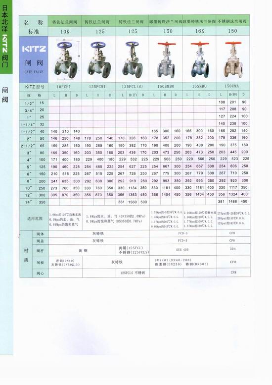 日本北泽KITZ铸铁法兰闸阀:闸阀的启闭件是闸板,闸板的运动方向与流体方向相垂直,闸阀只能作全开和全关 , 不能作调节和节流。闸板有两个密封面 , 常用的模式闸板阀的两个密封面形成楔形、楔形角随阀门参数而异 , 通常为 50, 介质温度不高时为 2°52' 。