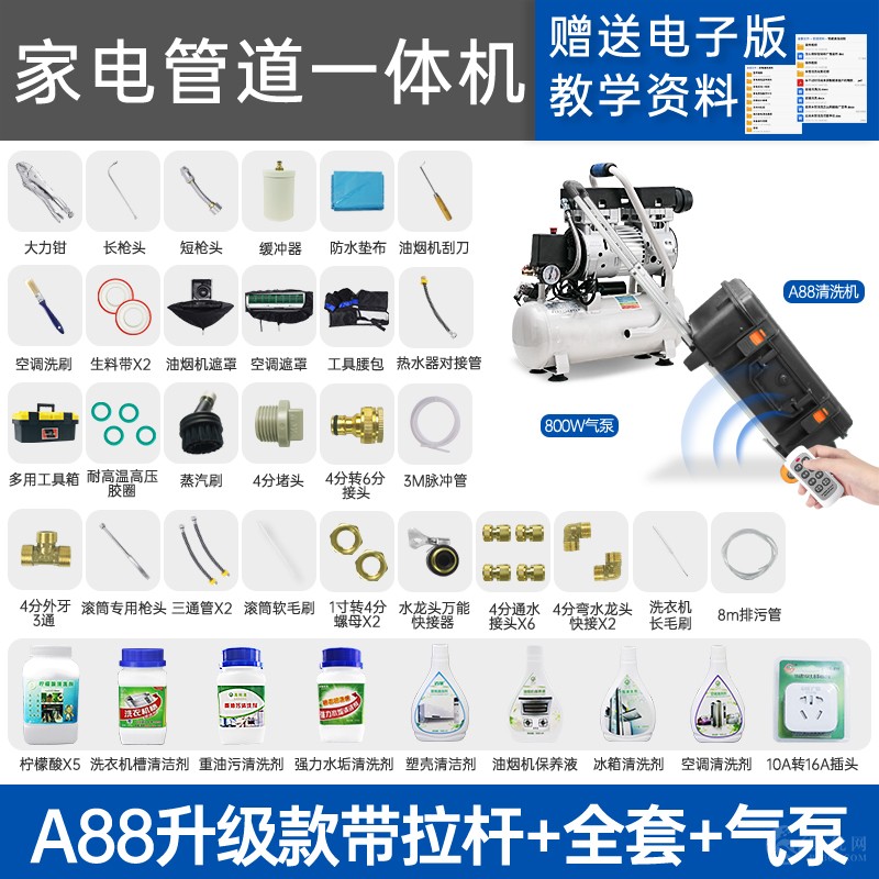 A88 款是一款集合家电管道二合一的设备,有 高温蒸汽、冷水、热水、臭氧、高周波脉冲功能, 3600 瓦大蒸汽型的,蒸汽压力是普通款的 2 倍,蒸汽 干湿度可调节(5 档),水压可调节(7 档),高周 波脉冲,专门为清洗自来水管而生,进口 ABS 机 箱,360°防水、抗压、抗摔、轻便、耐腐蚀,面板 设计简约大方,触屏款操作简单,管道精简易收 纳,喷枪隔热无电控、防水,喷枪即开即停无延 时,冷热水蒸汽一体,管道采用进口耐高温材料, 喷出水状灵活调节。
