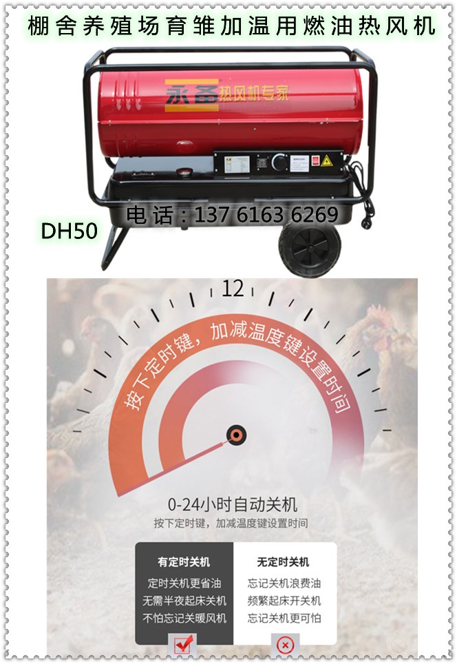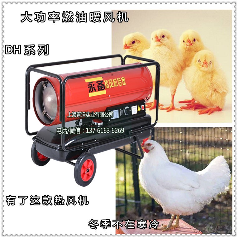 移动式养殖热风机 永备燃油热风炉又称为养殖暖风机在育雏前的诸多工作中无法达到此重要目标将使雏鸡活动,高度3米的育雏室,可以用一台DH50燃油热风机进行有效预热,预热时,操作者可以预先设定温度,DH50在育雏室达到需要的温度时,热风机会停止加温,低于设定温度时,自动启动加温,举例一个150平米这样,在夜间,基本可以实现无人值守,大大减轻了工作者的劳动量,燃油热风机的优点油热风机带有温度控制器,加温到设定温度后机器自动停机,在温度降低后可以自动启动,不需人员照看。非常的方便和安全。