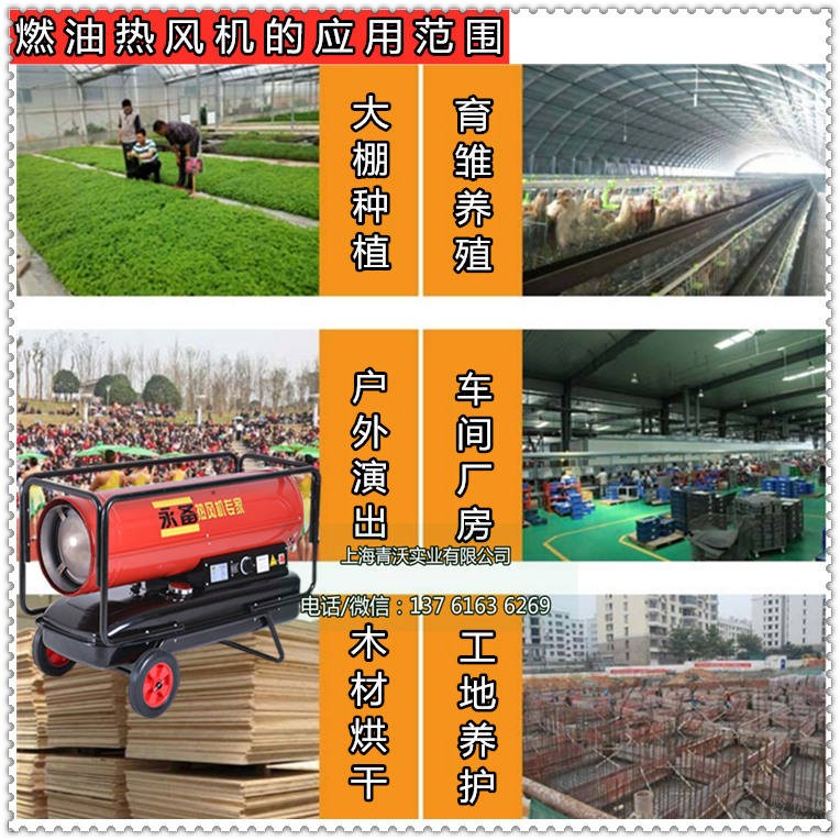 燃油暖风机是由通风机、电动机及散热器组合而成的联合机组,也是工业取暖器的一类,它是以燃油作为燃料发生热风,用于防寒取暖的设备。该取暖器具有简洁、灵敏、体积小、重量轻、热风功率强、操作简洁、安全可靠、用电少、耗油省等特点。尤其用于畜牧业、养殖、孵化、蔬菜大棚、产品烘干、建筑烘干等场所。下面介绍下燃油热风机的应用场所及特点: