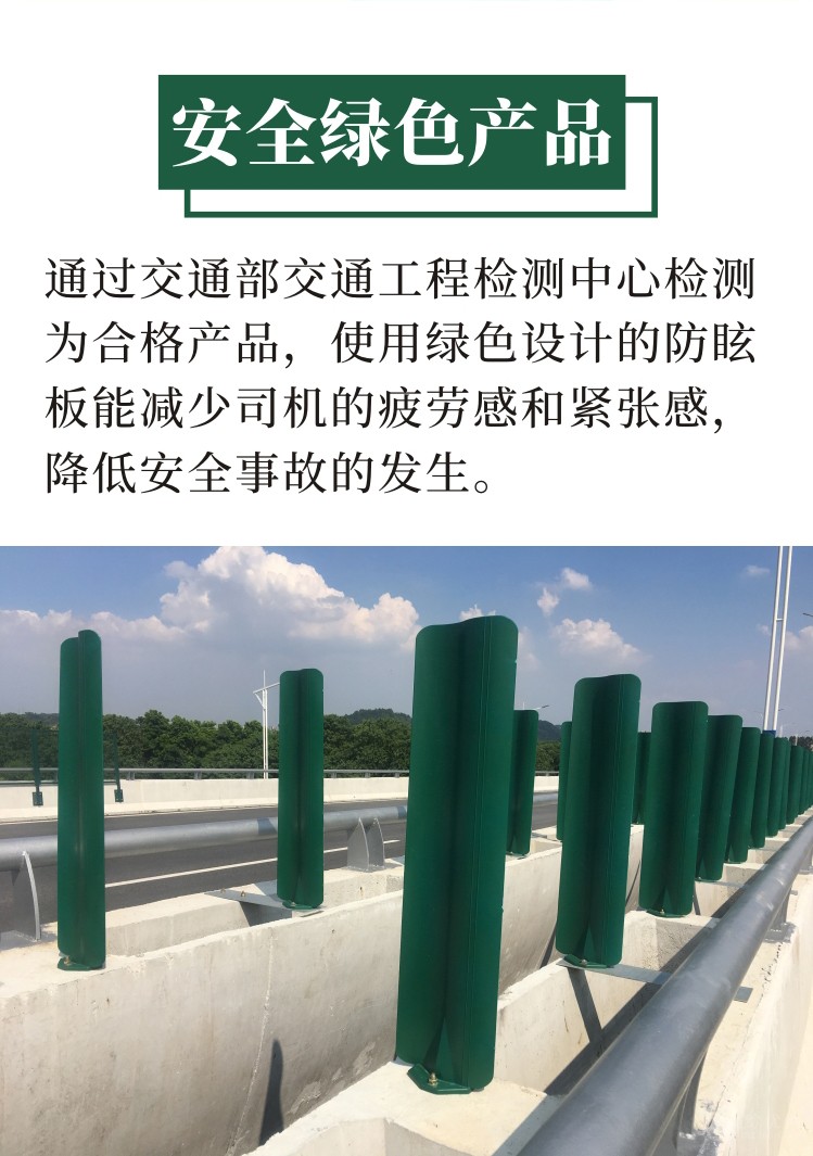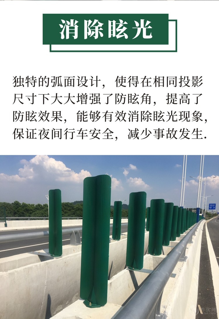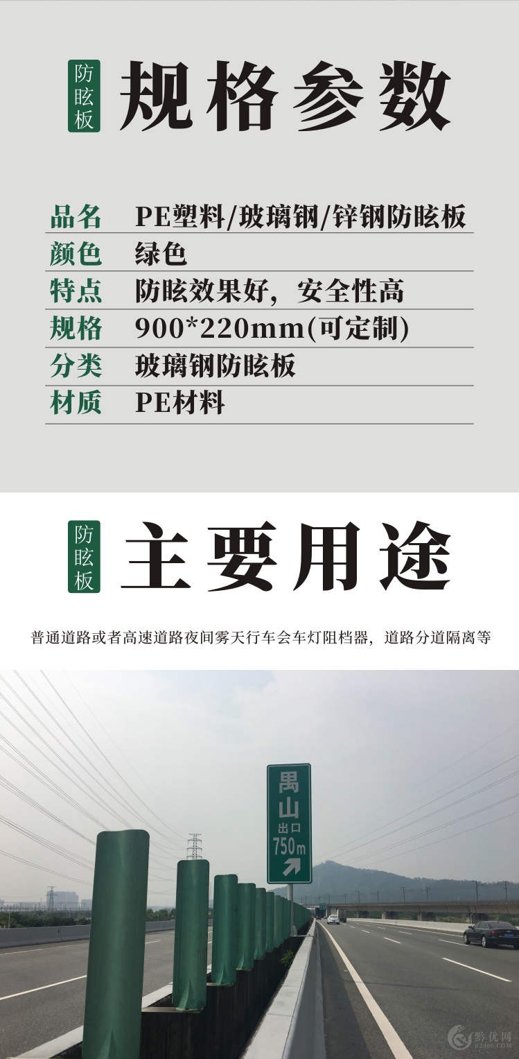 防眩板是为解决对向车灯眩光,生产制造的安装在高速公路中央分隔带上的一种交通安全产品。多设置于高速公路中央分隔带护栏上或护栏中间,也有一些设置在中央开口的活动护栏上,从材质上分钢制防眩板、塑料防眩板玻璃钢防眩板。从外观上分类,常见的有普通直板、反S形、仿浮雕防眩板、公路景观防眩板等。