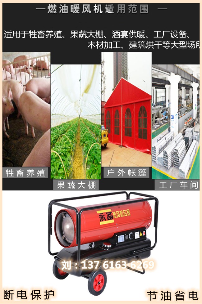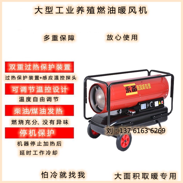 燃油热风机主要应用于大型厂房供暖、工厂车间取暖、养殖育雏加温、工业厂房采暖、农业大棚加温等,由于燃油热风机移动方便,升温迅速,热风温度稳定,不会出现忽冷忽热现象,机器自带恒温功能,当温度到达设置温度之后即停止耗油,低于设置温度2度后重新自动开启工作,取暖加温方便快捷,即买即用,无需任何安装,加油方可使用。给厂房车间带来了不可替代的便利,是冬季取暖加温的不二选择,相信燃油热风机将会为更多的厂房车间所使用,我公司出售的燃油热风机和XXX同行业的产品相比较,油耗更低,质量更稳定,售后更有保障,我们的产品整机质保1年,有任何的产品技术问题,我们一定尽全力的为您解答,保证知无不言,言无不尽。燃油热风机现面向全国诚招代理商,希望有意者联系上海青沃实业有限公司,我们真心的希望可以与您合作。