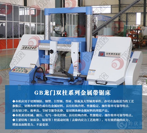 产品名称:锯床,带锯床,卧式带锯床,双柱式带锯床,金属带锯床,GB4240金属带锯床。GB4240 金属带锯床应用于切割高度400mm、宽度400mm的钢胚、铁板、无缝钢管及大型轴类零件,亦可在选取适当的工艺参数后,切割各种黑色或有色金属材料。具有可靠性高、效率高和高刚性等显著特点,可代替昂贵的进口设备。 机床通过机械、电气、液压的配合,自动进刀、切割完毕锯架自动快速上升(即退刀)的功能。