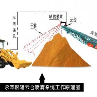 喷雾降尘智能跟随设备工作原理:利用云台的旋转功能和主从机的定位跟随功能,实现定点定时喷雾。将喷雾装置固定于云台之上,云台安装在皮带上方,俯瞰料堆四周和装车位。云台具有二轴运动,在水平面内可以360度旋转,同时在竖直面内能旋转一定角度。云台上装有跟踪主机,在铲车上安装跟踪从机,工作时跟踪主机和跟踪从机之间进行无线通讯,跟踪主机能实时得到跟踪从机的位置信息,并发出信号控制云台旋转,自动调整云台(喷雾装置)的工作姿态,对准工作铲车,进行喷雾抑尘。