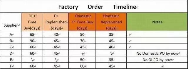 注:供应商出口订单一般要涉及到第三方验货发货,因此DI订单的生产周期会比Domestic订单的生产周期长一些不难理解,以上是一个简单的各供应商的生产周期的图示表格。