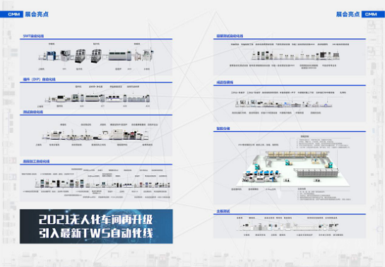 CMM 电子展整线真机展示无人化车间 ,业界最完整,规模最大,设备最多,技术最新,融合自动化线插件(DIP)、测试自动化线、前置加工线、组装自动化线、组装测试自动化线、成品包装线、智能仓储、主板测试等主题自动化展示区,2021年无人化车间再升级,引入最新TWS自动化线,展会现场通过对设备的工作流程、应用效果等环节进行充分展示,与会观众可零距离参与体验,感受参展企业设备的智能化、自动化、无人化的作业状态,洞悉行业发展趋势,寻求解决方案。