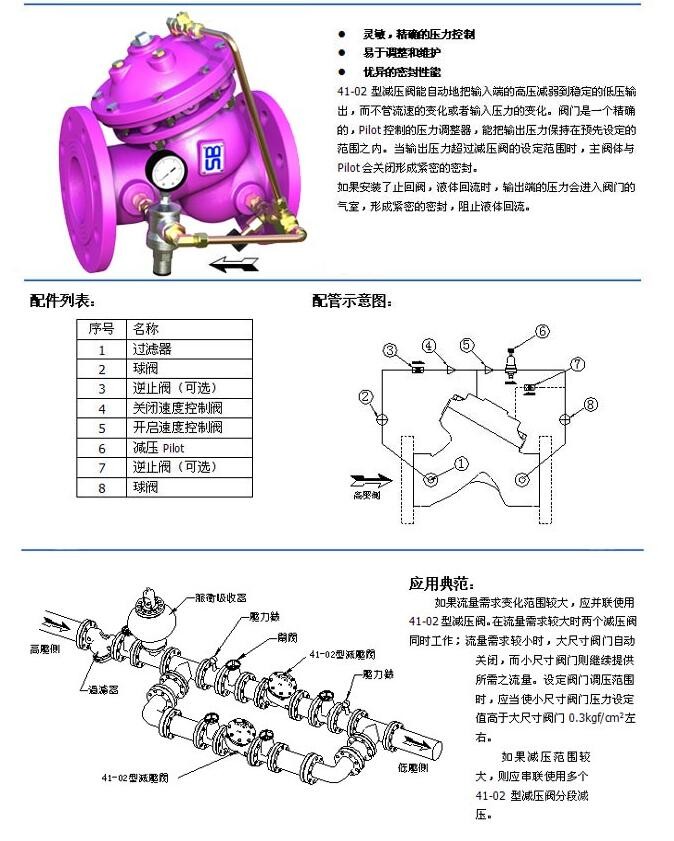 应用典范:如果流量需求变化范围较大,应并联使用41-02型减压阀。在流量需求较大时两个减压阀同时工作;流量需求较小时,大尺寸阀门自动关闭,而小尺寸阀门则继续提供所需之流量。设定阀门调压范围时,赢当使小尺寸阀门压力设定值高于大尺寸阀门压力设定值高于大尺寸阀门0.3kgf/cm2左右。