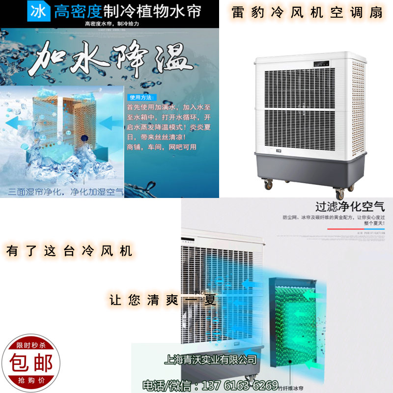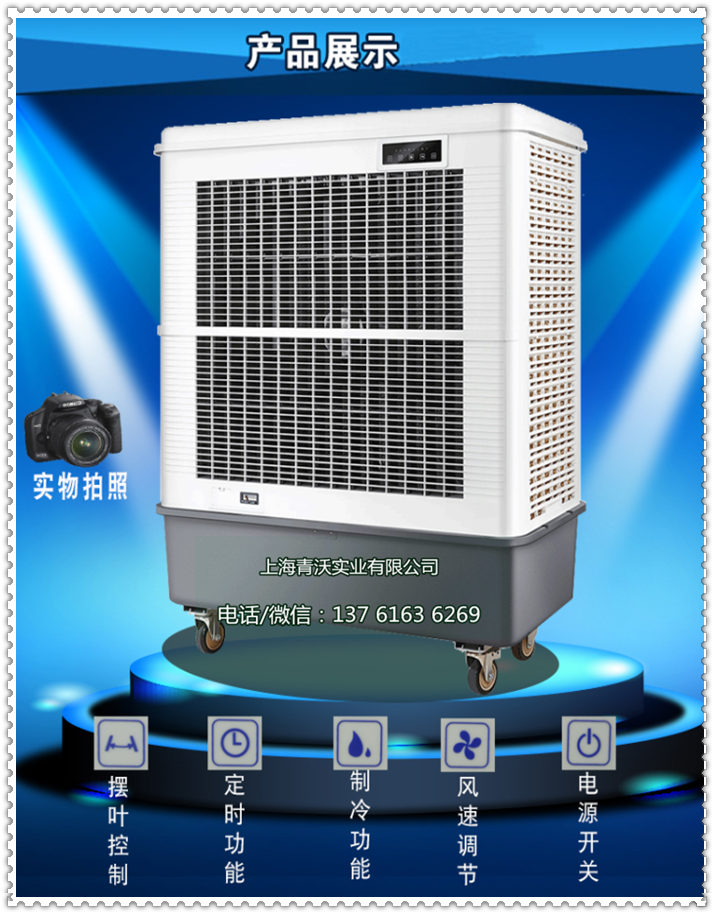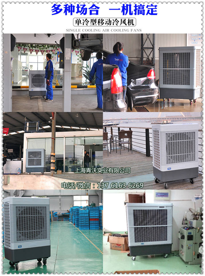 移动冷风机是一种夏天的降温设备,与空调、电扇等一样,可以用来降温。说到家用冷风机,就必须先提一下空调扇。空调扇是介于空调和电扇之间的一种降温设备。比电扇凉快很多。冷风机就是空调扇的升级换代版。由于目前市场上绝大多数空调扇制冷效果并不是特别明显,而且制冷时需要添加冰晶,因此非常麻烦。而冷风机就是空调扇的改良版,不但制冷效果更明显,而且不用添加冰晶,非常方便。此外,我们的移动冷风机还有净化空气的效果。不用担心不够凉快,而且还相当省电,耗电量是空调的十分之一。 移动冷风机的产品特点: 1、降温效果好:选用优质湿帘,蒸发效率远远超过劣质湿帘,降温幅度高达5-15度。 2、安全可靠:特殊定制的电机、水泵,保证经久耐用安全可靠。 3、覆盖面积广:压铸式铝风叶在保证风力柔和凉爽的基础上冷风覆盖面积可达150-250平方米。 4、移动方便:免安装费用、免人工、免风险,自带脚轮灵活移动,走到哪用到哪,使用简单又省心。 5、节能:每小时耗电量仅0.4-1度,运行成本低,耗电量只有传统压缩机空调的1/8. 6、环保:无氟利昂,集除味、换气、通风、降温、调节温度、湿度于一体。 移动冷风机降温原理: 当风机运行时进入腔内产生负压,使机外空气流过多孔湿润的湿帘表面迫使过帘空气的干球温度降至接近于机外空气的湿球温度,即冷风机出口的干球温度比室外干球温度低5-12℃(干热地区可达15℃),空气愈干热,其温差愈大,降温效果越好。由于空气始终是从室外引进室内,(这时候叫正压系统)所以能保持室内空气的新鲜; 移动冷风机使用场所: 1.几乎所有需要降温、岗位降温、局部降温的厂房车间等任何场所均可使用。 2.也可用于高温或有异味的工业生产车间,如化工厂、纺织厂、电子厂、机械厂等,也可用于岗位或全面降温通风换气。(已在工厂、网吧等行业取代空调)。 3.广泛适用于工厂车间、网吧、食堂餐厅、酒店厨房、员工宿舍、户外工作、休闲餐饮、办公室、门面、仓库等各种需要降温通风的场所。 4.特别适合固定工位降温、流动性工作岗位降温、设备检修流动降温、仓储搬运工作降温、室外临时工作降温等需要移动使用的场所,