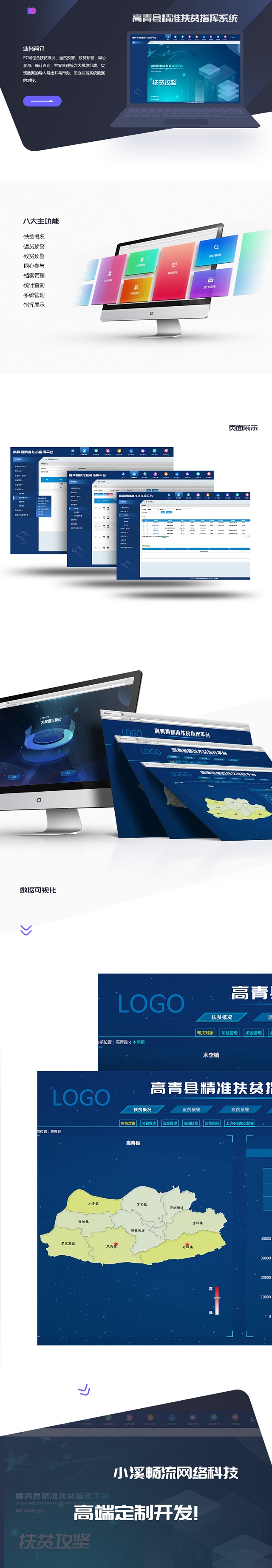 高青县精准扶贫系统PC端包含:扶贫概况、返贫预警、致贫预警、同心参与、统计查询、档案管理、指挥展示(数据可视化)七大模块组成。实现数据的导入导出并与市办、国办扶贫系统数据的对接。