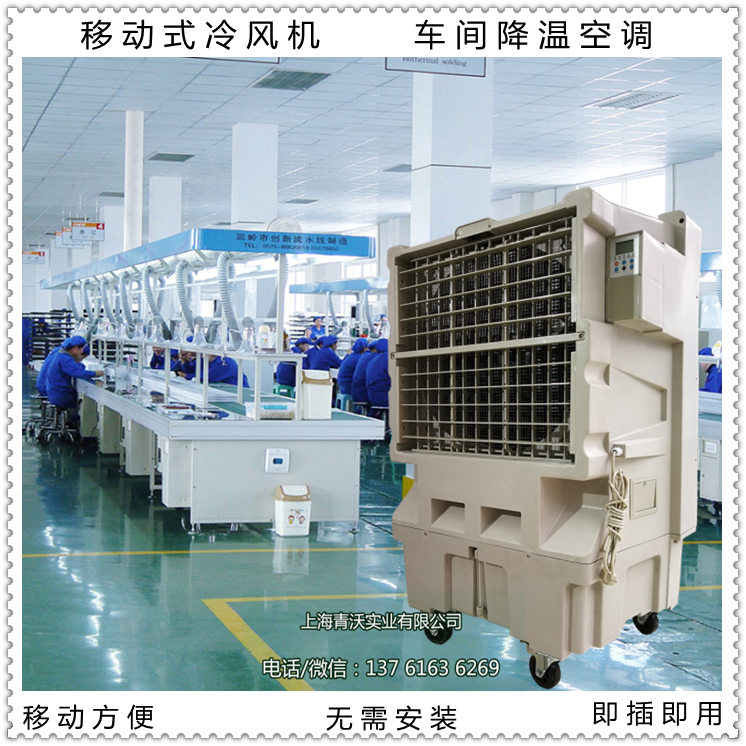 移动冷风机是一款结合了风扇、空调、冷风机的优点于一身的一体机,没有室外机,不需要安装,插电后能够直接输送凉风。把室外新鲜空气经过工业移动空调的过滤、源源不断地输送进来新鲜的凉风,将室内带有气味和浑浊闷热的味道排出室外,它的降温原理是利用水的蒸发过程吸收空气的湿与热,使空气温度下降。即利用室外空气干球温度与湿球温度的差值达到降温制冷的目的。这样蒸发式冷风机就源源不断地送出清新自然的冷风,而将室内高温、带有异味和粉尘的空气赶出室外,从而创造出一个清新自然的工作环境。