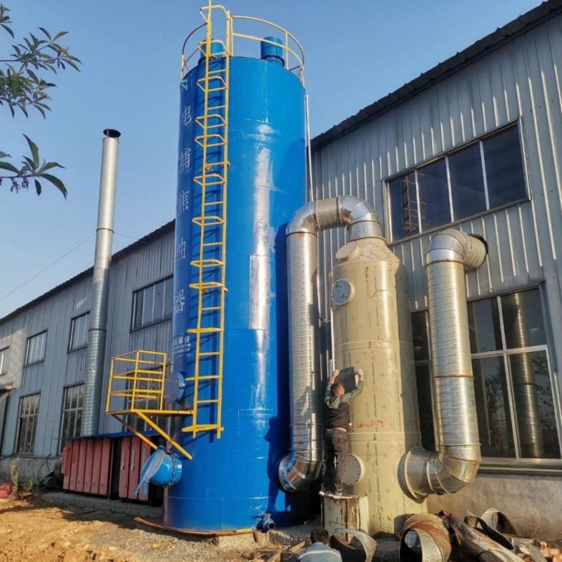 电捕焦油器介绍,电捕焦油器是用来捕集烟气中的焦油粉尘的装置。内部设有灭火装置,当检测到连续温度超过120℃或连续有明火时,自动启动灭火装置。它采用静电净化法,主要依靠放电极和沉淀极两个系统来完成对焦油粉尘的捕集。当设备运行时,在两极间接入高压直流电,电极在空间产生阴、阳离子并使其作用于带电粒子,并吸附于静电场中的焦油粉尘颗粒表面,使焦油粉尘颗粒带电。在电场力的作用下,带电焦油粉尘颗粒向其极性相反的电极移动,*终沉积于电极表面,达到收尘的目的。极板上装有电动刮板,当电极表面的粉尘和焦油沉积到一定数量时,电动刮板动作,对极板进行清理。在高温和刮板的作用下,沉积的粉尘和焦油落入灰斗。定期打开灰斗下面阀门,使灰渣排入渣箱运走。净化后的烟气经排烟风机送入烟囱,*终排入大气。