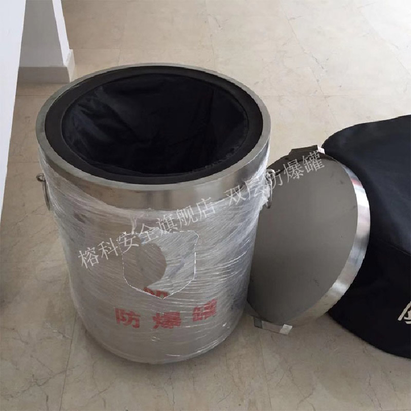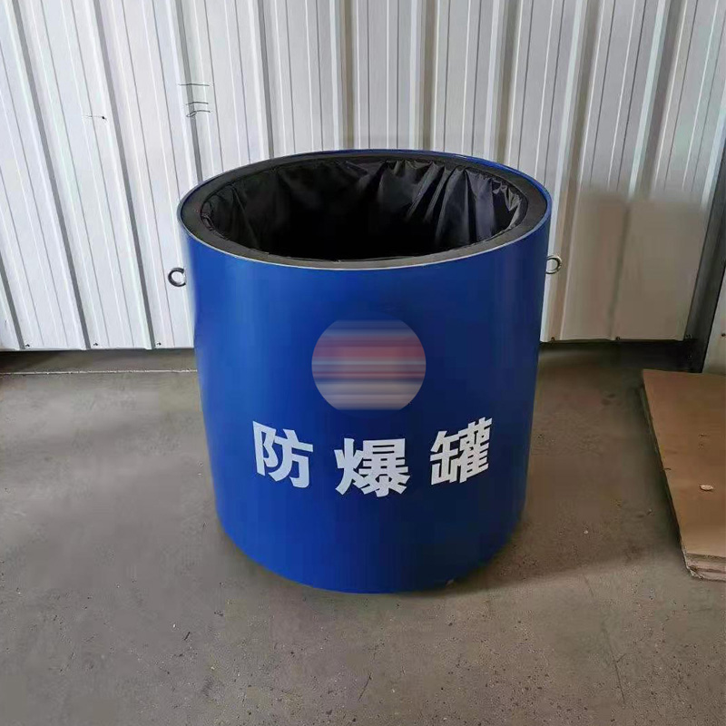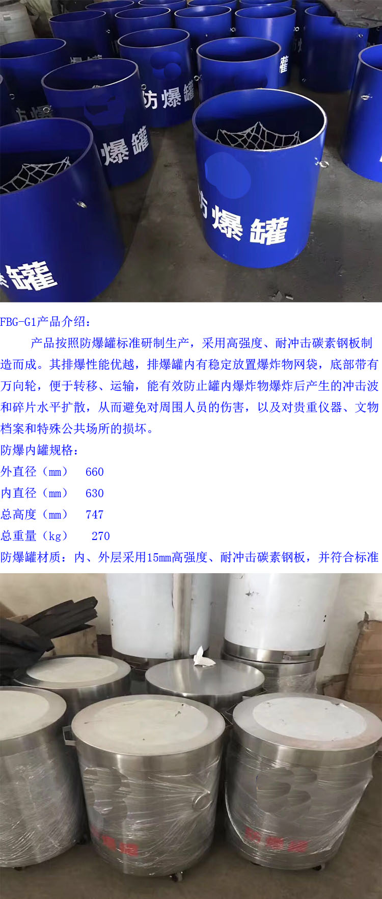 产拼照<GA 871-2010>防爆罐标准研制生产,采用缚度、耐冲击碳素钢板制造而成。其防爆性能优越,防爆罐内有稳定放置BZW网袋,底部带有万向轮,便于转移、运输,能有效防止罐内BZW后产生的冲击波和碎片水平扩散,从而避免对周围人员的伤害,以及对贵重仪器、文物档案和特殊公共场所的损坏