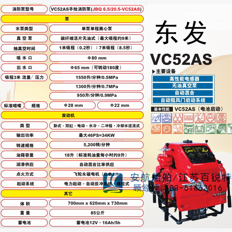 2、消防产品:日本东发VE1500W森林消防水泵,日本东发VE500AS/V20FS/V20ES/V20D2S手抬消防泵,VC52AS东发泵,VC82ASE手抬泵,手抬机动消防泵,VF53机动消防泵,VF63AS-R消防泵,AH-100E呼吸器填充泵,野渡翁空气压缩机,呼吸器充气泵,MCH6/ET空气充气泵,MCH6/EM空气填充泵,MCH13/ET,MCH16/ET,MCH18/ET,德国宝华JUNIOR II呼吸空气压缩机,BAUER200,BAUER250,BAUER300,充气箱,应急消防泵,65CWY-40消防泵,50CWY-27移动消防泵,50CWY-32消防泵,手摇泵,船用卧式自吸离心泵,船用水泵,手抬机动消防泵,泡沫输转泵,机动输送泵,正三轮消防摩托车,消防车,背负式高压泡沫灭火器,高压细水雾灭火装置,移动式排烟机,船用co2灭火,船用氮气保护装置,PHYM压力泡沫比例混合装置,通岸接头,空气泡沫比例混合器,灭火器,灭火器架,灭火器罩,耐火救生绳,泡沫液,三段切换可pp24c/pp32c消防炮,消防水炮,消防泡沫炮,移动式消防水炮。电控消防水炮,电动消防炮,PQ8.C手提式泡沫灭火装置,消防水带,消防水带接扣,消防斧,移动泡沫灭火装置,移动高压细水雾,背负式森林消防水泵,高扬程水泵。