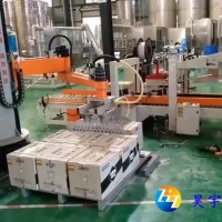 机器人码垛机应用于各种装箱成型后的箱体进行自动转移,整理,码垛作业。箱体自动传输进入差速输送线,按照要求通过旋转输送装置自动进行整理排布,由自动推箱机构推入指定位置,同时栈板通过输送线自动传输到特定位置,在机器人操作下对整理好的箱体进行自动码垛作业,完成入库前准备。本机推瓶方式可选择连续动作或单一循环动作,操作适应性高,同时适用各种饮用品后段包装箱码垛作业。采用PLC可编程计算机自动控制器、光电开关、行程开关、气动控制等控制系统,机械动作的准确性高,且操作容易。码垛系统采用高jing度机器人作业,动作稳定、故障少。