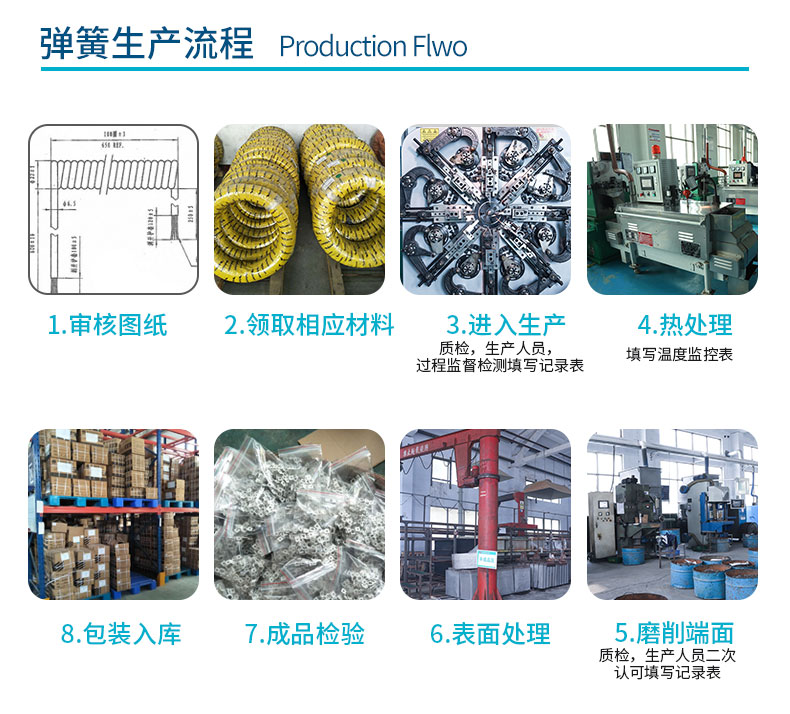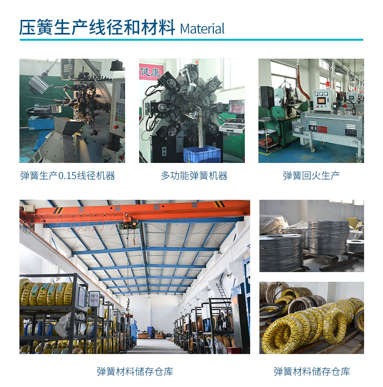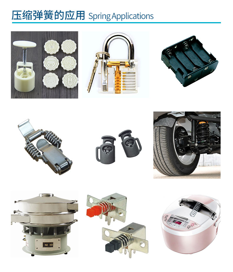 压缩弹簧(压簧)是承受向压力的螺旋弹簧,它所用的材料截面为圆形,也有用矩形和多股钢萦卷制的,弹簧为等节距的,压缩弹簧的形状有:圆柱形、圆锥形、中凸形和中凹形以及少量的非圆形等,压缩弹簧的圈与圈之间有间隙,当受到外载荷时弹簧收缩变形,储存形变能。