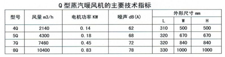 7Q蒸汽型暖风机是以蒸汽为热媒,供厂矿企业、生产车间及其它大型建筑物中的热风采暖。是经过热工性能试验的,性能稳定可 靠的产品。是由通风机、电动机及散热器组合而成的联合机组。适用于允许空气循球的各种类型的车间,当空气中不 含灰尘、易燃、易爆性的气体时,可作为循球空气采暖之用。
