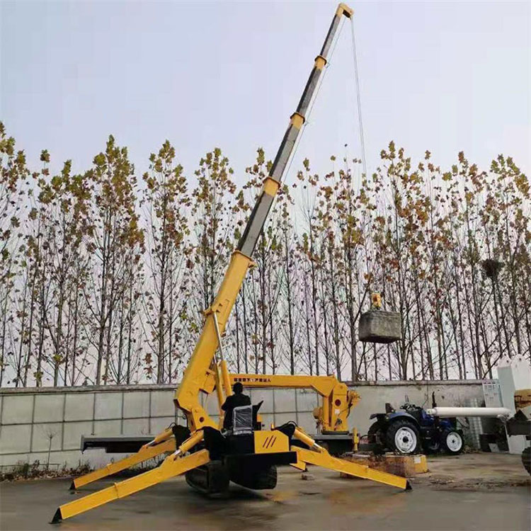 供应异形吊车_室内用吊车_小型蜘蛛吊顾名思义其形状和普通吊车有所不同,随着技术的不断进步,在设计人员的不懈努力之下,我公司研制出一种新款异形吊车美其名曰蜘蛛吊。机身体积小,四个支腿伸展开后外形似蜘蛛,其支腿可离开地面起到保护地面的作用。其力支腿、吊臂、行走互锁;U型结构吊臂,焊缝少,不易变形;我们采用锰钢材料,载重能力大,履带采用合成橡胶材质使其防滑性增强,可在泥泞道路和山地自由行走;起重速度可以根据所起吊的东西重量自动地调整。