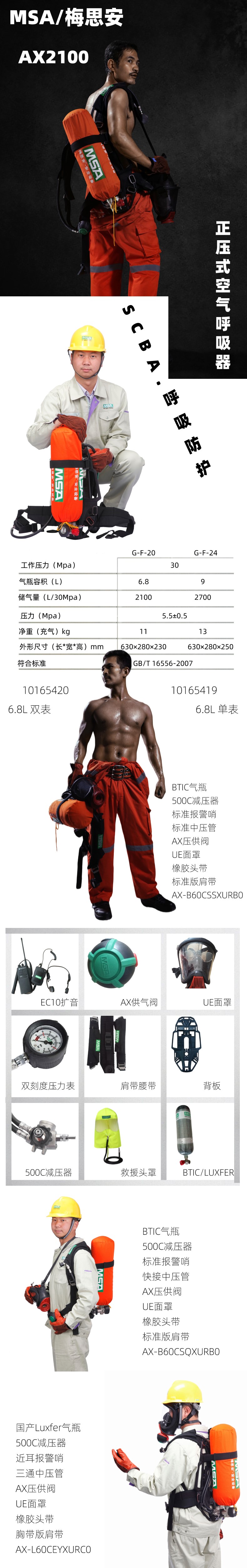 BTIC气瓶,无表,500C减压器,标准报警哨,标准中压管,AX压供阀,UE面罩,橡胶头带,标准版肩带,AX-B60CSSXURB0;