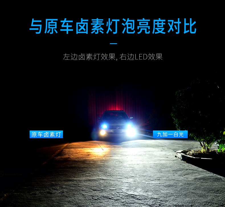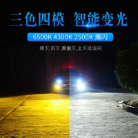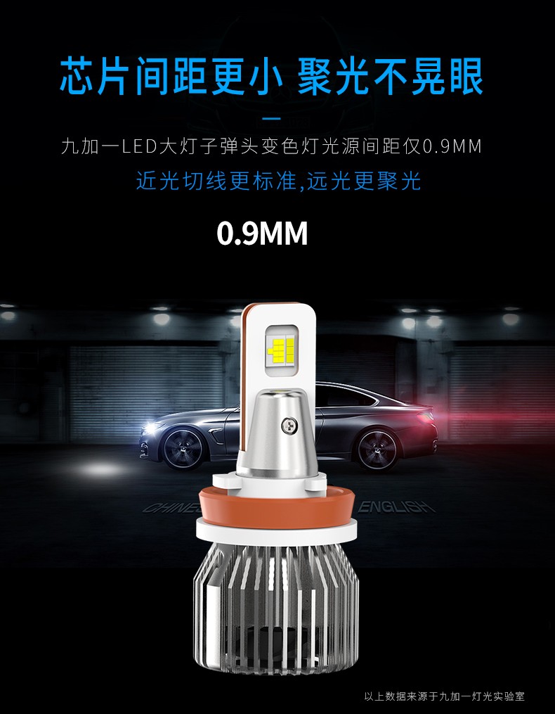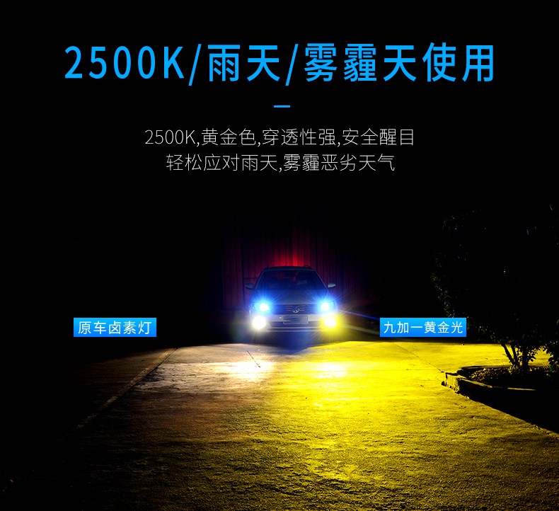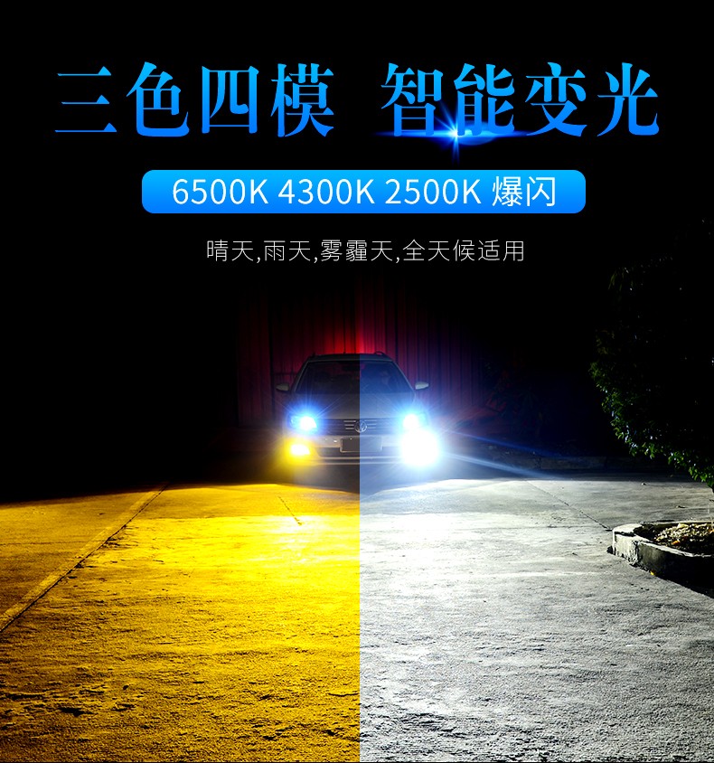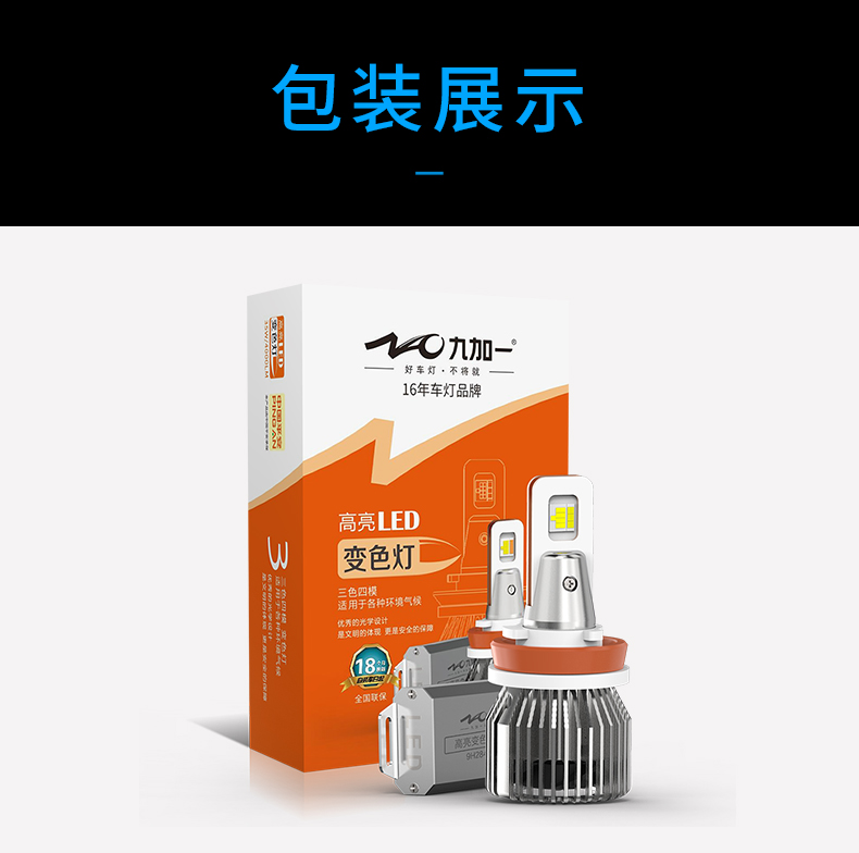 这一款变色灯是三色四模的使用结构,升级高亮,适用于各种环境气候是其(8)的特点,晴天,雨天,雾霾天,全天候适用。6500K晴天适用,6000K纯白光,显色性好,照路清楚,不易视觉疲劳。4300K轻雾天适用,4300K色温,也叫黄白光,暖白光,晴天、薄雾天使用。2500K雨天,2500K黄金光,穿透性强,安全醒目,轻松应对雨天、雾霾天等恶劣天气。对比传统的卤素灯,变色灯效果更佳。采取四块铜基,四倍导热。九加一变色灯,创新采用4块铜基高效导热,导热速度是普通LED大灯的4倍以上。该产品芯片间距更小,其光源间距仅0.9MM,近光切线更标准,远光更聚光。在使用方面一开一关,即可轻松变光。汽车启动默认灯光为白光,关掉再开为4300K黄白光,再关再开为2500K黄金光。
