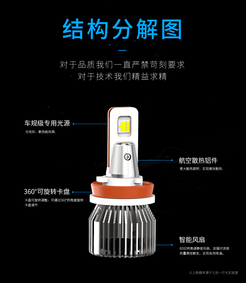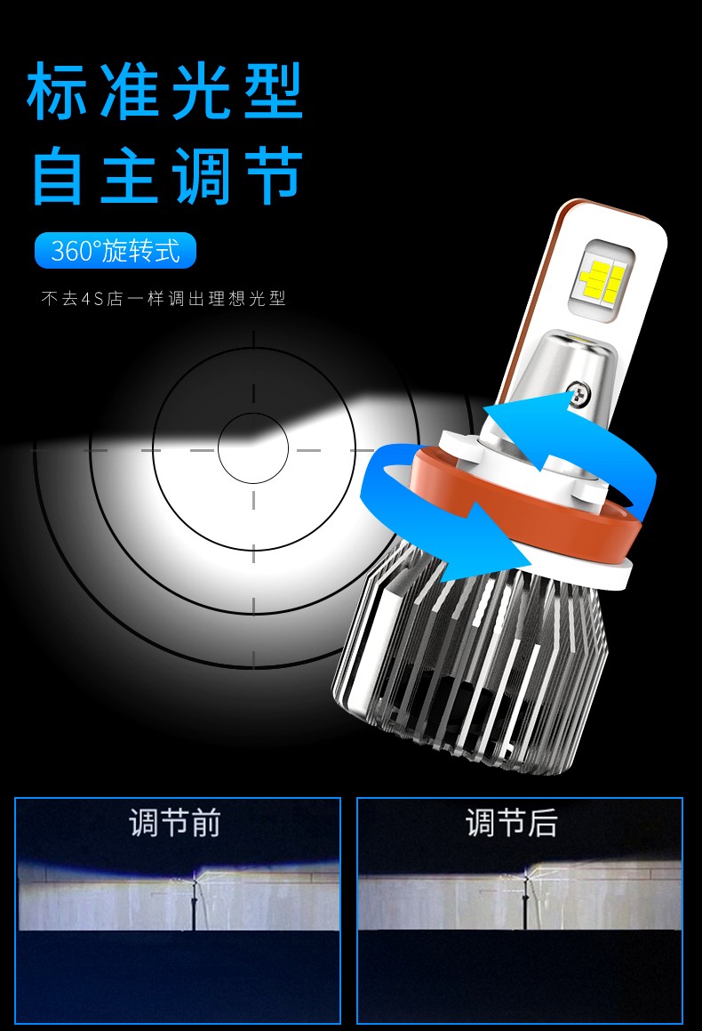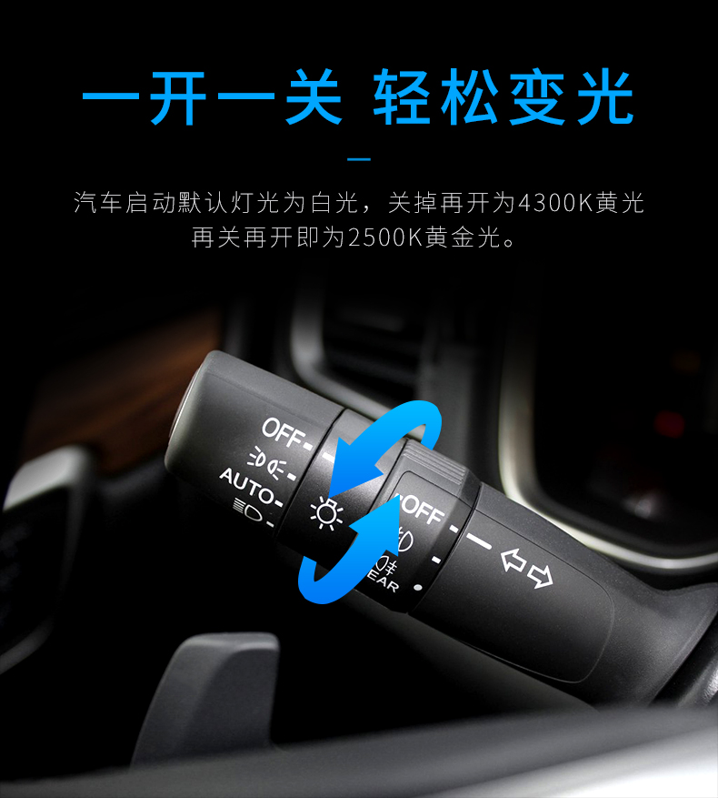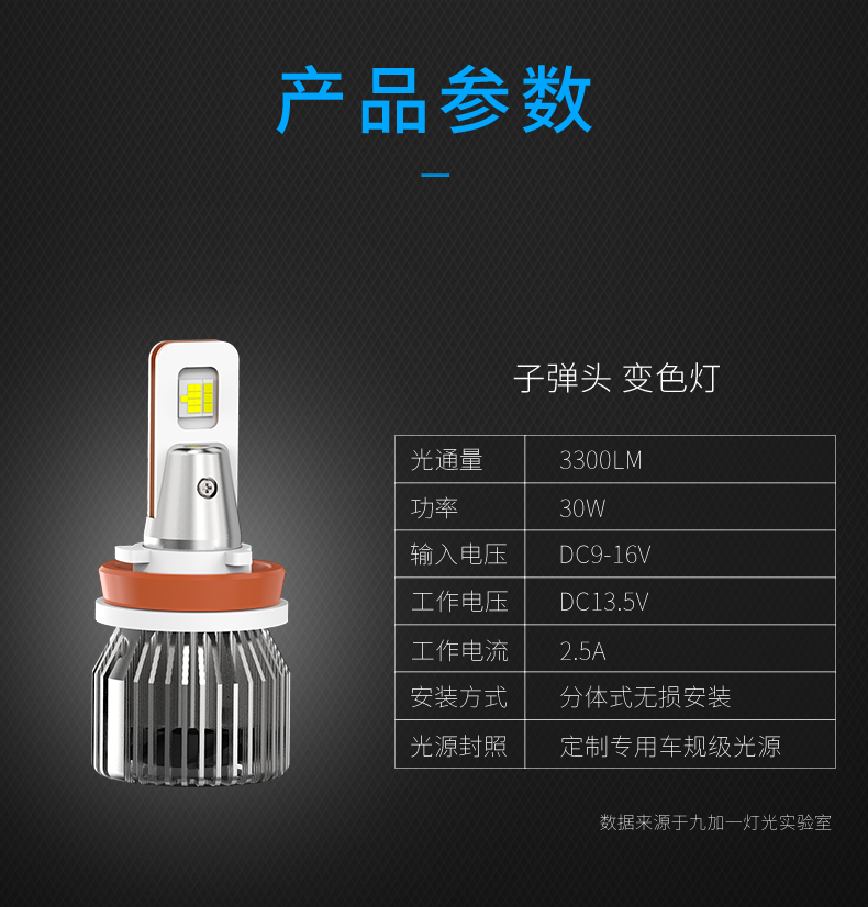 这一款变色灯是三色四模的使用结构,升级高亮,适用于各种环境气候是其(8)的特点,晴天,雨天,雾霾天,全天候适用。6500K晴天适用,6000K纯白光,显色性好,照路清楚,不易视觉疲劳。4300K轻雾天适用,4300K色温,也叫黄白光,暖白光,晴天、薄雾天使用。2500K雨天,2500K黄金光,穿透性强,安全醒目,轻松应对雨天、雾霾天等恶劣天气。对比传统的卤素灯,变色灯效果更佳。采取四块铜基,四倍导热。九加一变色灯,创新采用4块铜基高效导热,导热速度是普通LED大灯的4倍以上。该产品芯片间距更小,其光源间距仅0.9MM,近光切线更标准,远光更聚光。在使用方面一开一关,即可轻松变光。汽车启动默认灯光为白光,关掉再开为4300K黄白光,再关再开为2500K黄金光。