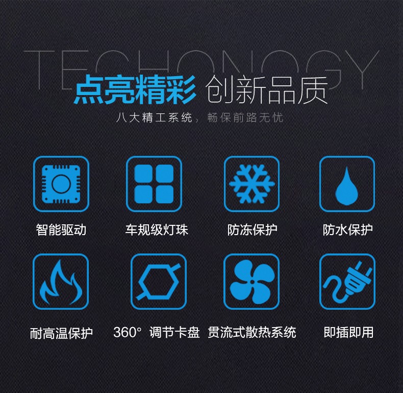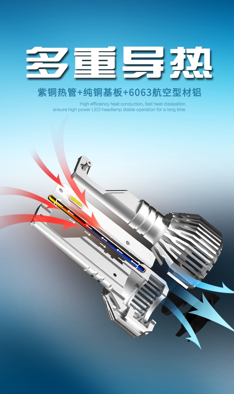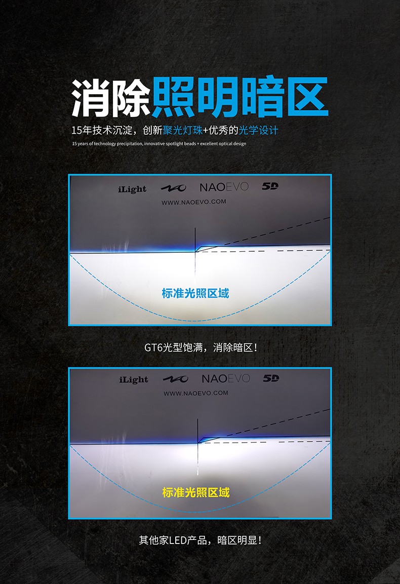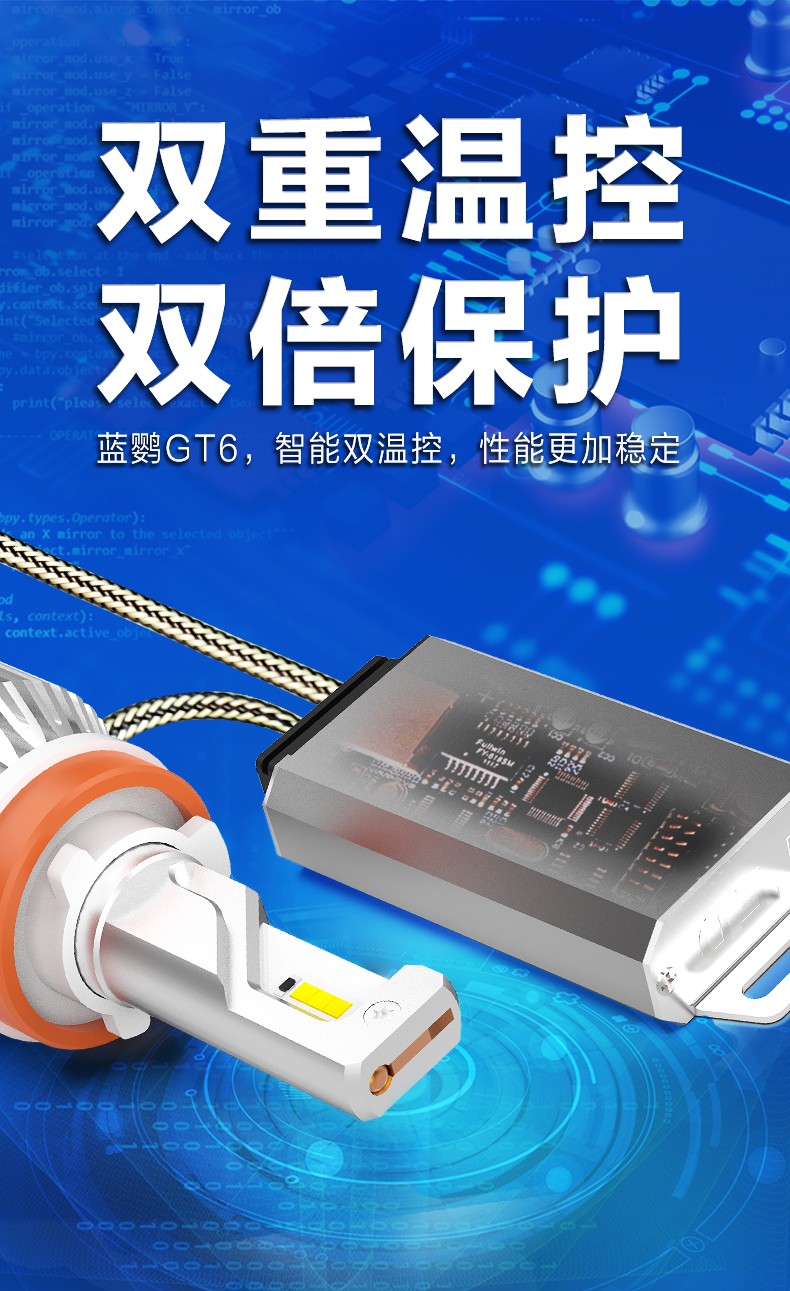 蓝鹦GT6是本公司2021高性价比主打款,十五年车灯厂家全新力作。该产品可供卡车、轿车通用,GT6宽电压设计,9-100v可用。其特点为GT6光型饱满,可消除暗区,因其自带近光光型切线设计。GT6采用聚光灯珠,远光聚灯。材质方面采用了单颗75mil聚光灯珠设计,远光聚光性好,照射距离远,会车不晃眼。同时,GT6搭载高速静音风扇,可达8000转分,经久耐用,性能稳定。在散热方面,采用了四重导热以及大面积贯流散热,材质方面选择了紫铜热管+纯铜基板+双6063航空性材铝以及大面积鳍片贯流式散热系统,高效散热。蓝鹦GT6采用灯体+驱动双重热敏温控技术,双倍保护,性能更加稳定。在安装方面,其灯体短小,节省安装空间,通装率高,安装方便。