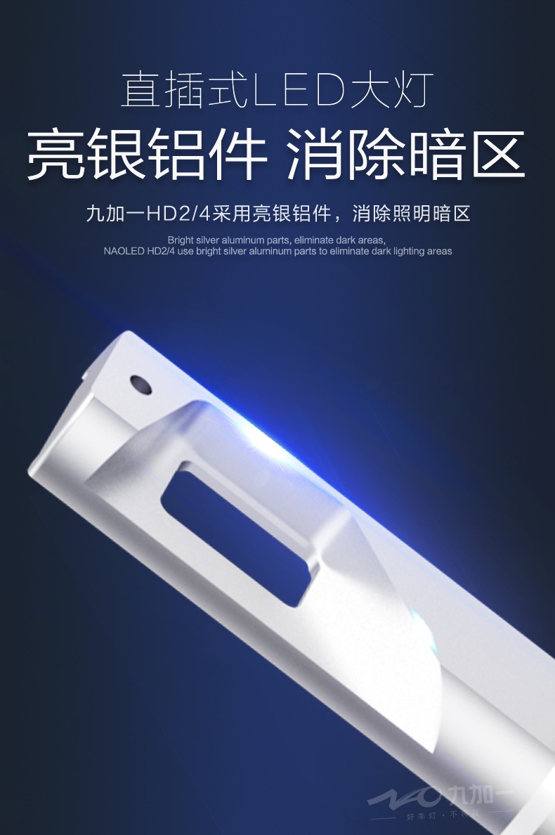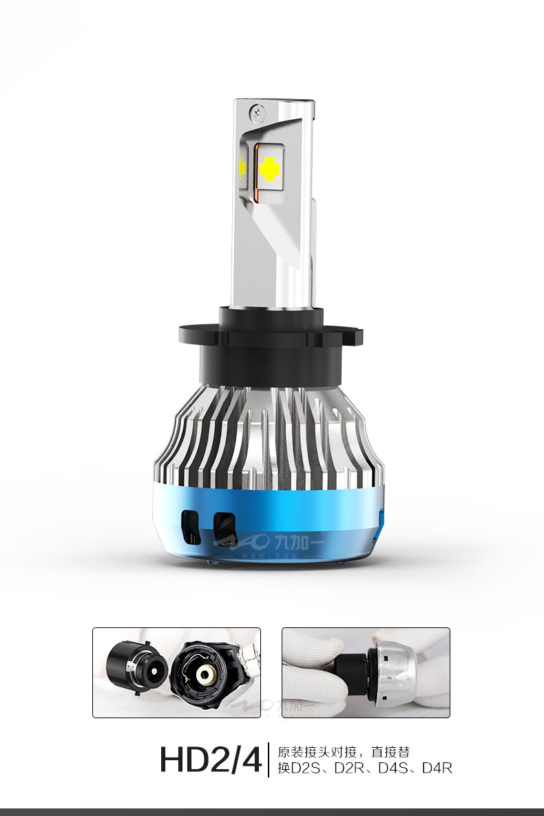 HD2/4采取原装接头对接,直接替换D2S、D2R、D4S、D4R,一键解决氙气灯升级系列难题。九加一HD1/3开启LED直接替换氙气灯新时代。安装九加一直插时式大灯HD24,不用拆原车安定器,原装接头对接,安装更简便。此外还采用了三重导热,高效散热达,九加一HD2/4,紫铜热管+铜基+6063航空铝材三重导热,高效散热。其还创新采用十字型聚光灯珠,科学排列,光型饱满,与原车氙气灯双光透镜更加匹配。该产品采用亮银铝件,反光性好,大限度反射光线,消除汽车照明暗区,行车更安全。此外九加一还创新采用十字型聚光灯珠,科学排列,光型饱满,与原车氙气灯双光透镜更加匹配。九加一HD24卡盘采用360度可调设计,方便安装,自主调出标准光型。