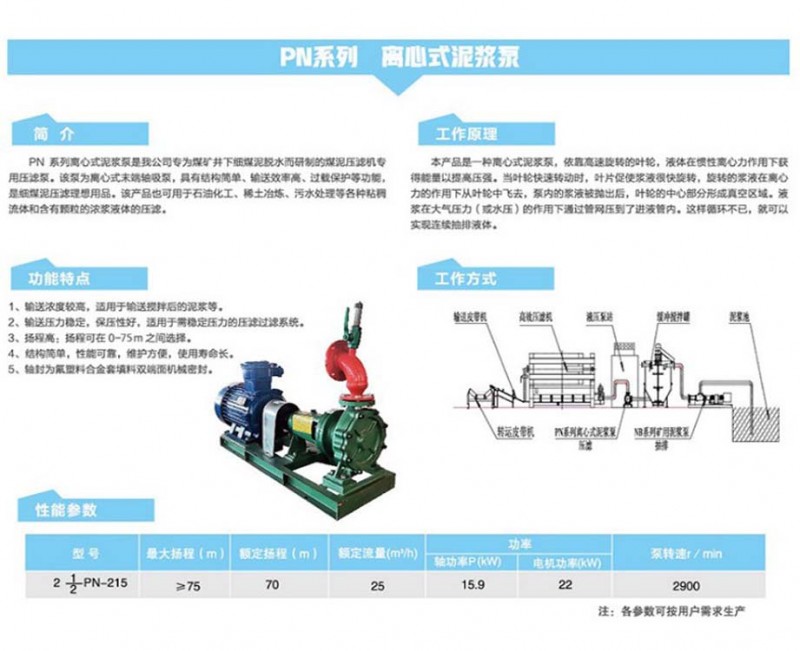 PN系列离心式泥浆泵是我公司专为煤矿井下细煤泥脱水而研制的煤泥压滤机压滤泵。该泵为离心式末端轴吸泵,