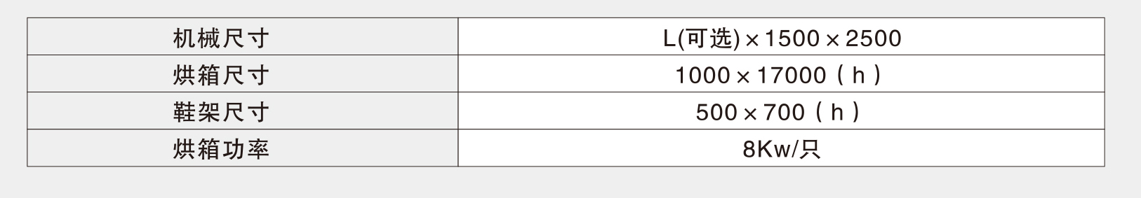 特点:1. 采用挂篮 转式,可在一条线上完成结帮、贴底;2. 可选用近红外洪道或热风循环烘道;3. 占用空间小,工作较紧凑;4. 植头可在下盘中回送。技术参数: