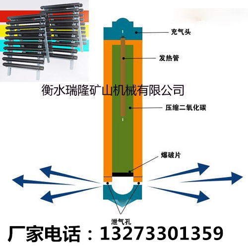 二氧化碳物理致裂利用的是液态二氧化碳吸热气化膨胀,压力急速上升的物理原理。由灌充液态二氧化碳的钢管,活化器,泄能组件,充气组件,点火电路连接组件,以及XXX连接辅助组件组成。通过活化器加热使液态二氧化碳瞬间气化,释放高压气体能量,破裂岩石、煤层、混凝土等目标材料。解决了以往用咋要致裂开采和预裂中破坏性大、危险性高、矿体粉粹等缺点,为矿山安全开采和预裂提供可靠*证。