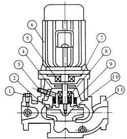 | 1 | 排阀 | IHG型结构说明: 1.机械密封前置有承磨付,泵盖上设有密封冷却,冲洗孔,适用于抽送介质易挥发或晶的场合,延长在介质含微小颗粒时机械密封的使用寿命。 2.泵与电机轴承组合装置,保证轴运转精度,提高了密封的可靠性。 3.机械密封采用硬质合金材质。