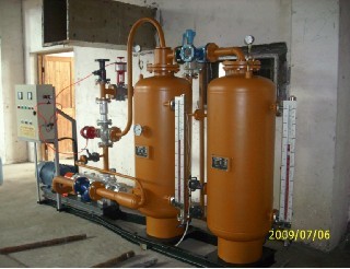 (5)结构简单:集闪蒸罐、冷凝水快排装置、压力平衡装置、液位变器、除污器、汽蚀消除器、蓄水箱为一体。一般情况蓄水箱平衡装置压力设备在0.1MPa以下,系统运行是能达到自动启闭、自动报警、自动调压及冷凝水泵自动切换等一系列智能化程序控制。设备整体性好、安装维修方便。