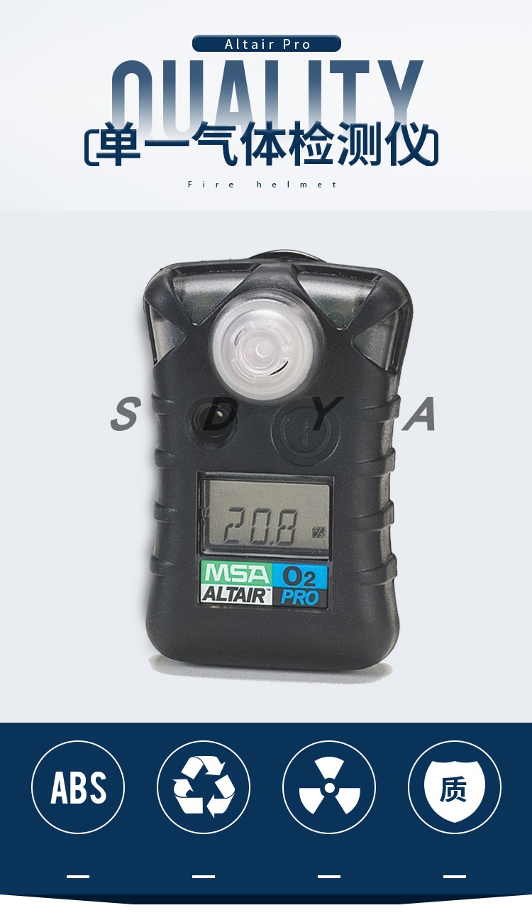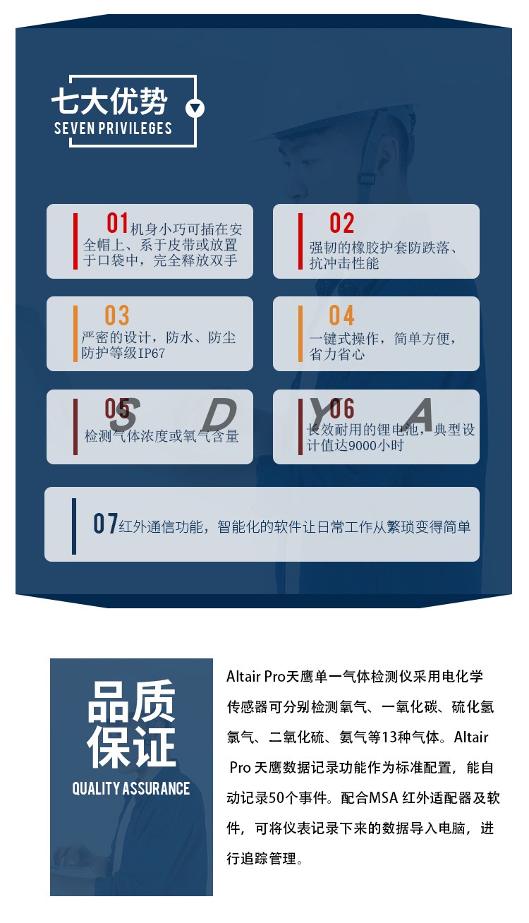 Altair Pro天鹰单一气体检测仪采用高精度的电化学传感器检测环境中的有毒气体浓度或氧气的百分比浓度。可分别检测氧气、碳、硫化氢、氯气、二氧化硫等13种有毒气体。 Altair Pro 天鹰已嵌入了数据记录功能作为标准配置,能自动记录*近的50个事件。配合MSA 红外适配器及软件,可进行报警设置的修改,也可将仪表记录下来的数据导入电脑,进行追踪管理。
