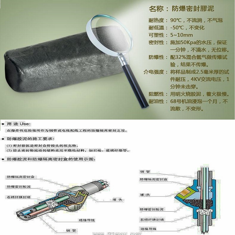 FBN-A型防爆胶泥采用多种高分子聚合物,添加剂,增塑剂等经过特殊工艺配置而成,是一种深黑色,无溶剂(无味),环保,对人体无害的无规则外型的胶泥状物。广泛应用于国防、石油,化工,加油站,变电站,危险性仓库及其它方面的危险场所,作为钢管或电缆配线工程的防爆隔离密封之用。在性危险场所作为钢管或电线配线工程的防爆隔离密封之用,可用来包导线,接头,电缆,管材,地线等,防止火灾。